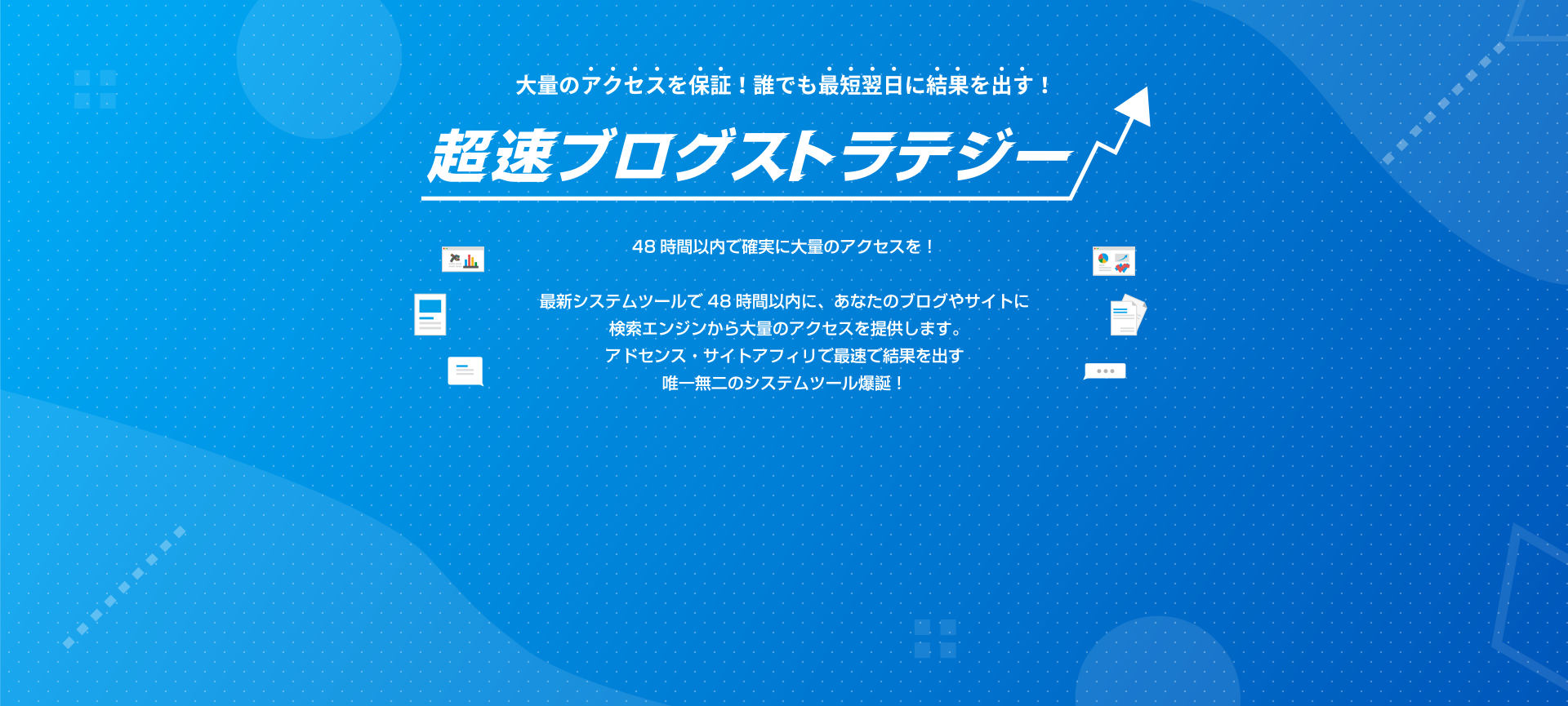 副収入を得たいと思っているからこそ 超速ブログストラテジーのページをここまでお読み頂いているかと思います。 今や、就職すれば一生食べていけた時代と変わり 国を上げて副業が推進されている時代です。 また、老後2000万円問題なども記憶に新しいかと思います。 お金に関する常識はどんどんと変わってきており、 給料とは別の収入源を得ていかなければいけない時代になっていることは あなたも生活する中でひしひしと感じているのではないでしょうか。 それでも、アルバイトは結局時間の切り売りで 肉体的にとてもきつい副業になってしまうでしょうし、 在宅でライター副業を始めたとしても、2000文字書いて数百円というレベルなので、 書いても書いてもまとまった収益には繋がりにくいでしょう。 超速ブログストラテジーは、たった1記事のサイトやブログにも 最短24時間で大量のアクセスを送ることが可能です。 その後やることは、報酬の確認をすることだけ。 もちろん、残りの時間で本格的にブログ運営を始めて さらに報酬を伸ばしていくのも良いでしょう。 報酬を得ながらのブログ運営なら、高いモチベーションで実践し続けていけますよね。 超速で稼ぎながらのブログ運営で、 効率の良い副業をあなたも始めてみませんか?